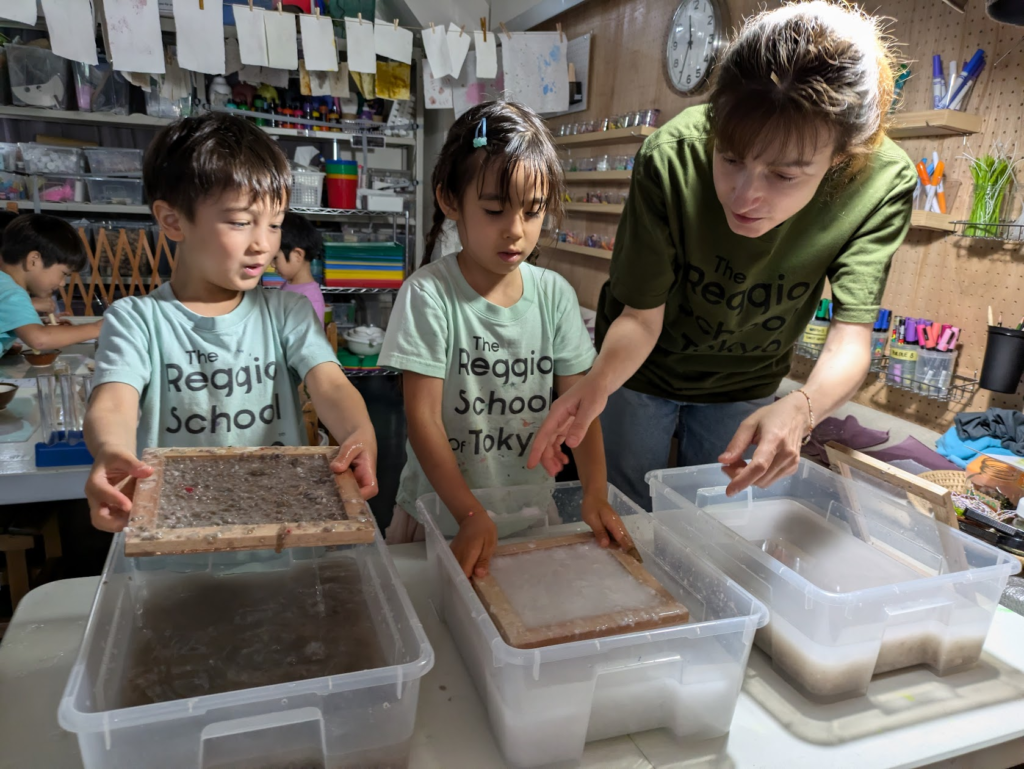 With a professional background in art, atelieristas can give children deeper, more meaningful experiences. Here we can see Ana using her background knowledge of paper and print making to create paper.