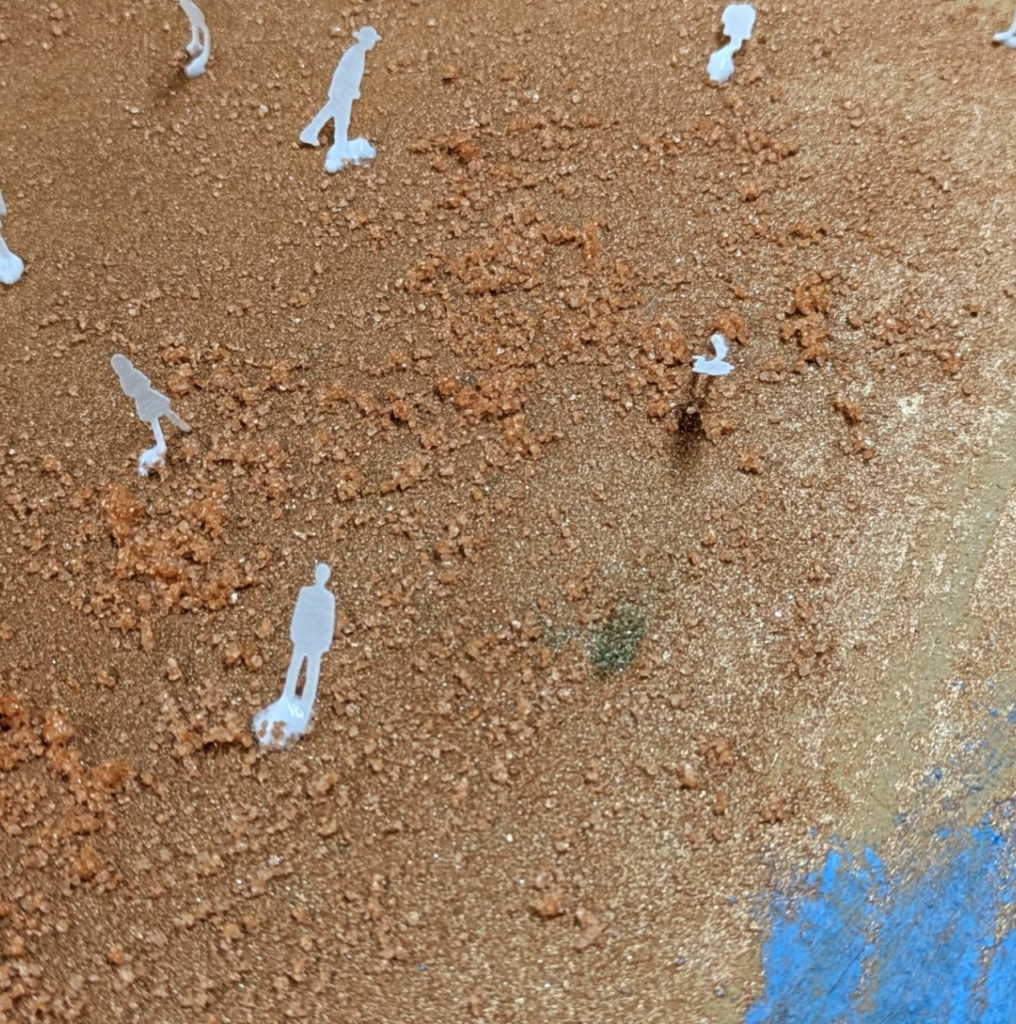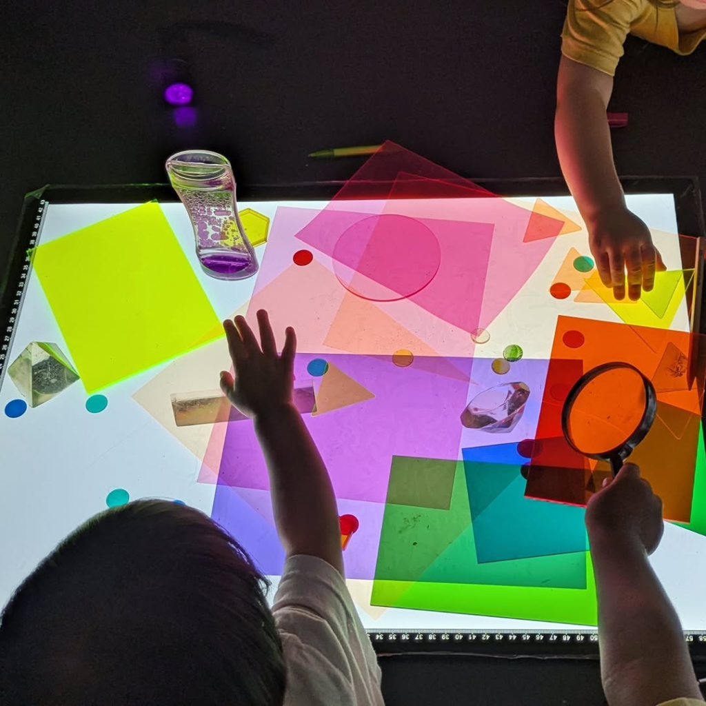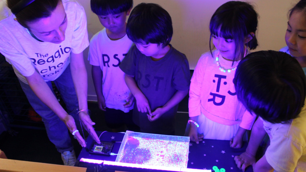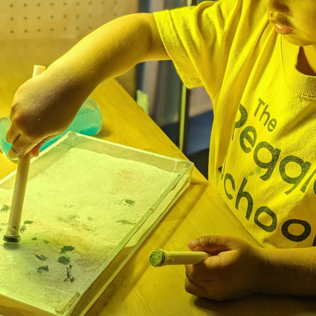 While some materials may seem simple, ideas which the atelierista and children come up with can create unique experiences through everyday items. Scraps of cardboard can be stamps, and with a UV light, sand, beads, and recycled toys can glow with new perspective.